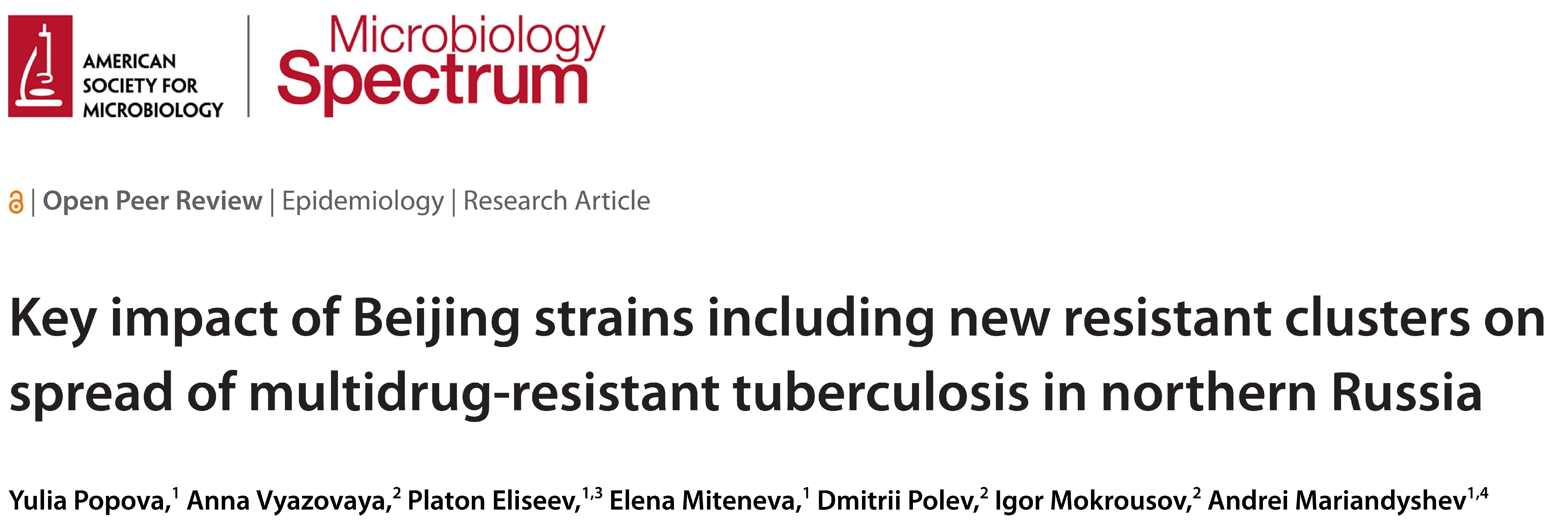 Журнал «Microbiology Spectrum» опубликовал статью «Key impact of Beijing strains including new resistant clusters on spread of multidrug-resistant tuberculosis in northern Russia», подготовленная в соавторстве с учёными Института Анной Вязовой (автор для переписки), Дмитрием Полевым и Игорем Мокроусовым.