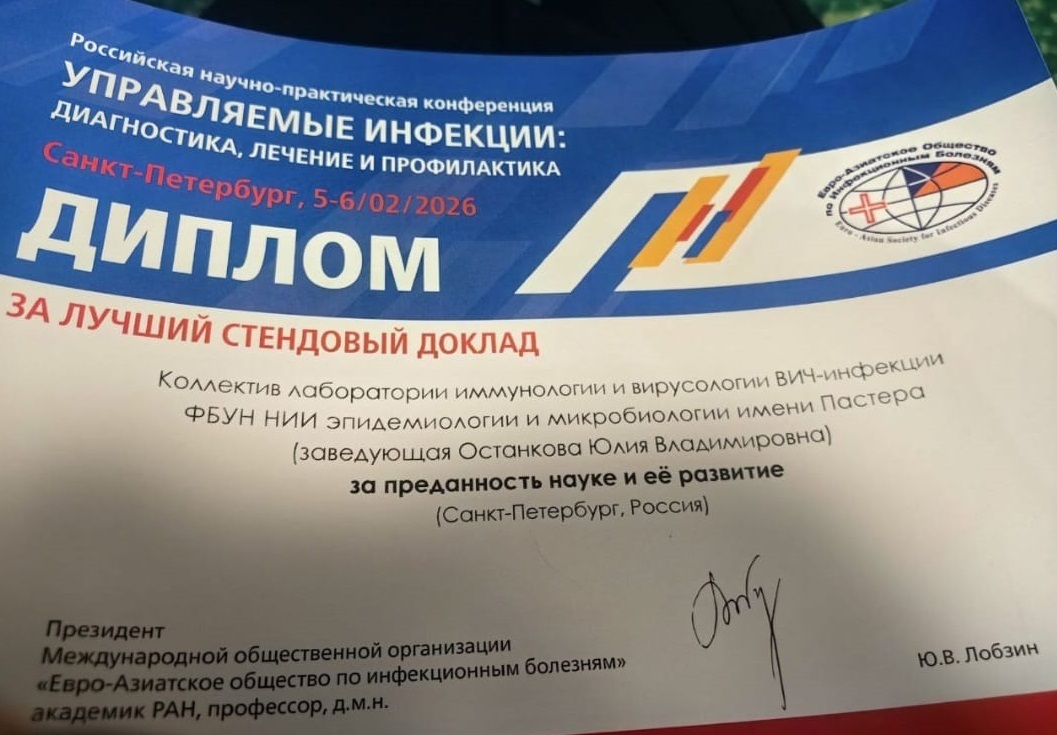 Коллектив лаборатории иммунологии и вирусологии ВИЧ-инфекции под руководством Останковой Ю.В. был удостоен Диплома Конференции «За преданность науке и её развитие» за лучший стендовый доклад.