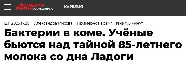 12 ноября 2025 г. на сайте «Аргументы и факты. Карелия» вышел репортаж «Бактерии в коме. Учёные бьются над тайной 85-летнего молока со дна Ладоги», в котором приводятся комментарии заведующего лабораторией метагеномных исследований Института Дмитрия Евгеньевича Полева.