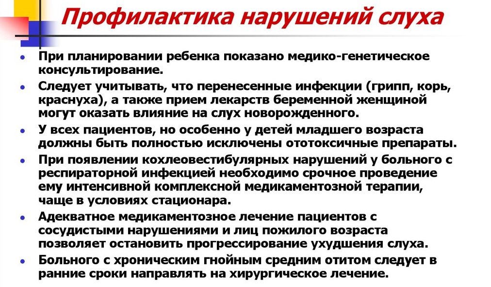 Универсальных способов профилактики потери слуха и глухоты не существует. Отдельные врожденные заболевания предотвратить невозможно, в особенности в случаях, когда мать не знает о том, что заражена вирусом. Зачастую сложно установить, что вы заражены латентным вирусом, в особенности при слабо выраженных симптомах или их отсутствии. Регулярные обследования – самый эффективный метод профилактики в таких случаях.