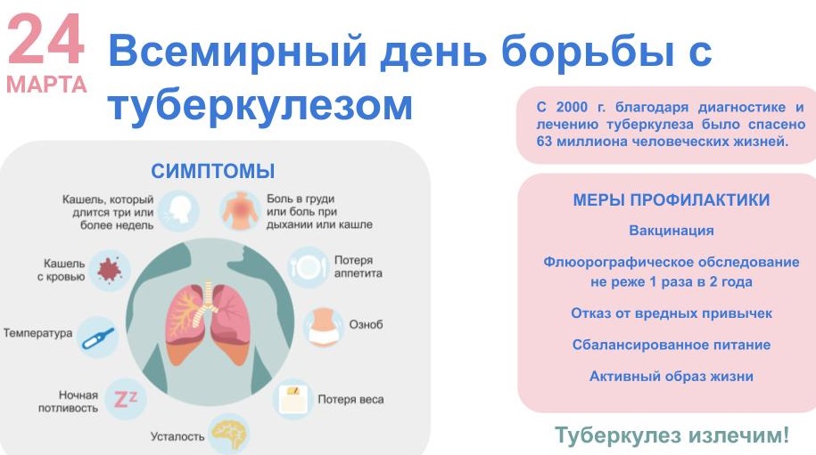 День борьбы с туберкулёзом, который проводится ежегодно 24 марта, был учреждён Всемирной организацией здравоохранения и Международным союзом борьбы с туберкулёзом и лёгочными заболеваниями в 1982 году, в год 100-летия со дня открытия возбудителя туберкулёза немецким бактериологом Робертом Кохом. В 1921 году впервые был вакцинирован прививкой БЦЖ новорожденный ребенок. Это послужило постепенному сокращению массовых заболеваний и развитию продолжительного иммунитета к туберкулезу.