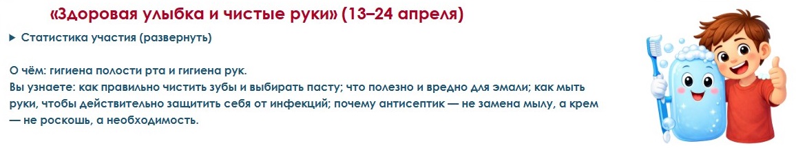 С 13 по 24 апреля 2026 г. Роспотребнадзор проводит первый модуль Всероссийского специального проекта «Диктант здоровья» под названием «Здоровая улыбка и чистые руки», посвященный вопросам соблюдения правил гигиены рук и полости рта. Второй этап «Движение – жизнь. Питаемся правильно» запланирован с 4 по 22 мая, третий этап «Используем гаджеты рационально» – с 15 сентября по 6 октября.