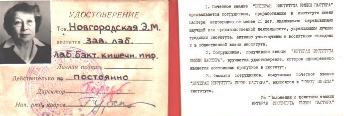 Удостоверение Ветерана Института имени Пастера Награждена орденом «Трудового Красного Знамени», медалями «За оборону Ленинграда», «За доблестный труд в Великой Отечественной войне 1941-1945 годов», «За доблестный труд в ознаменование 100-летия со дня рождения В.И. Ленина». Эмма Моисеевна Новгородская скончалась 15 августа 1975 г., похоронена на Серафимовском кладбище Ленинграда. |
